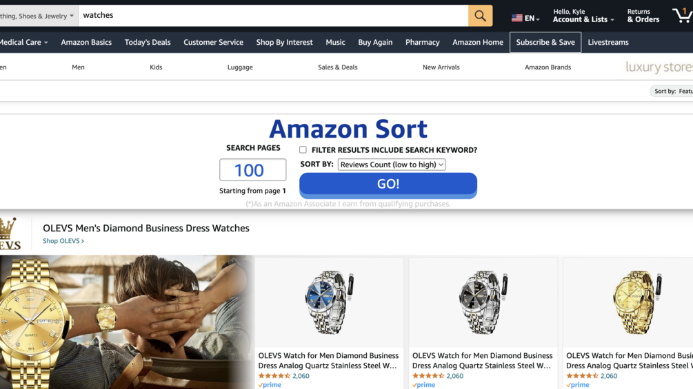 Amazon doesn't include sorting for amount of ratings and this tool allows you to. Why is this important? I've personally gotten hundreds of dollars worth or free product for messaging sellers with zero ratings in exchange for a review in less than 10 minutes of messaging sellers. Additionally, you can use the tool to filter for items that have potential and need a marketing boost. If you run an ad agency and know how to help amazon sellers, this is the perfect tool to secure new clients. Make sure to select the box of options to narrow down the product selection before using the tool, as this will allow it to search more than 7 pages. For example, instead of just searching watches which will get you 7 results, select the mens option in the box below and then over 100 more pages will be available for the tool to sort from. To access the tool, bookmark the website and then click on the bookmarked site whenever on the amazon page. Then from there select your sorting options.